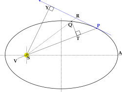 Newton's first Corollary (to the above proof) states that the velocity of the body (v), represented by L, at positions A, B, C, D, E, F, etc. (Fig 8) is inversely proportional to the perpendicular distance of its tangent from the force centre (Fig 10; p)